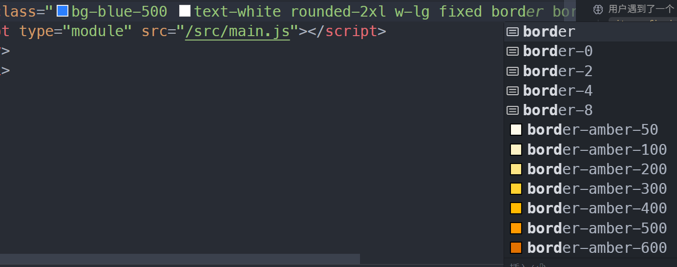 这里的 * 就是对应的内容,现在在前端就可以直接使用这个类名了,并且带有代码提示: