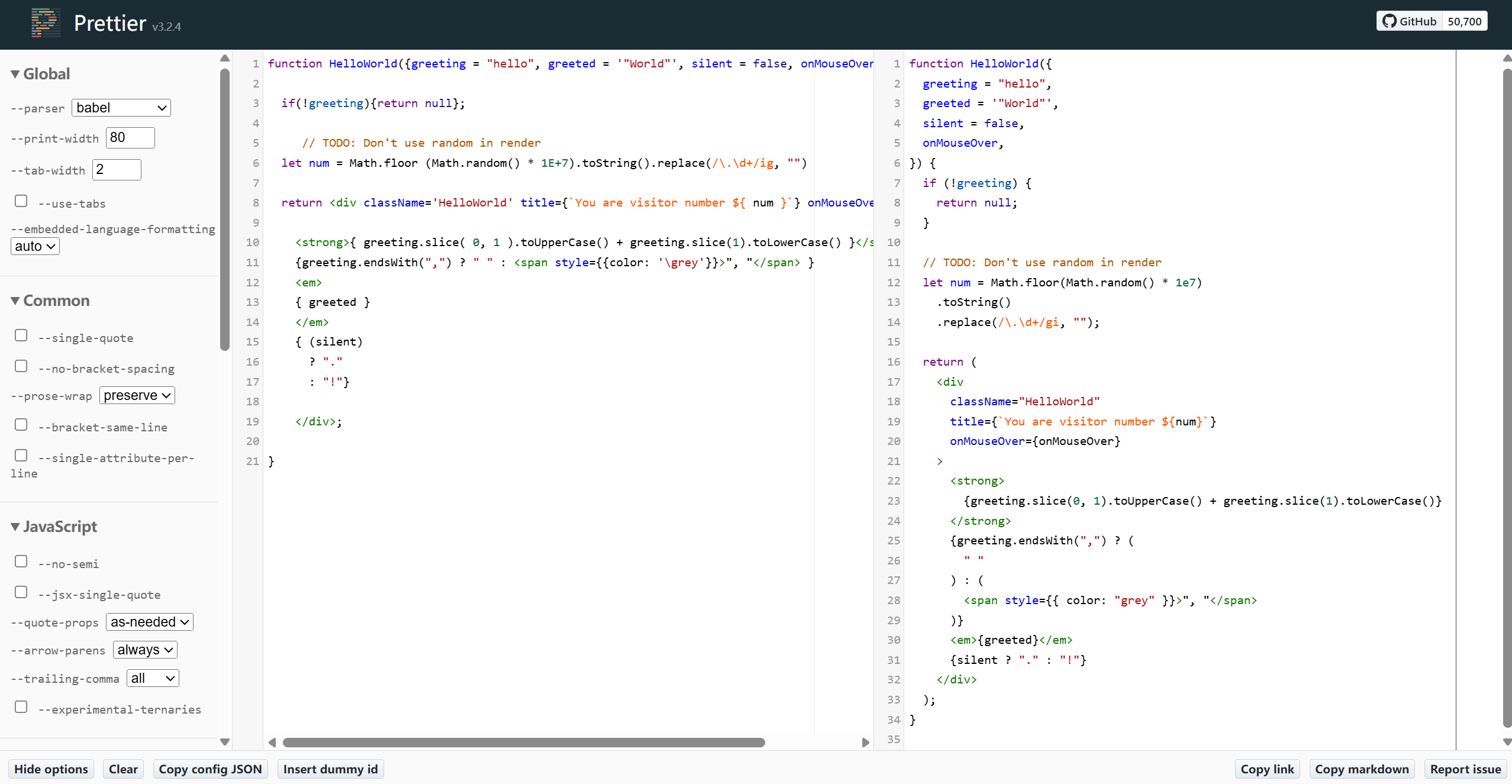 我们肯定需要规定一下代码的样式, 否则这个东西就没有什么意义了. 这里可以直接前往官网的 Prettier v3.2.4 PlayGround, 直接在这里对照勾选需要的东西即可.